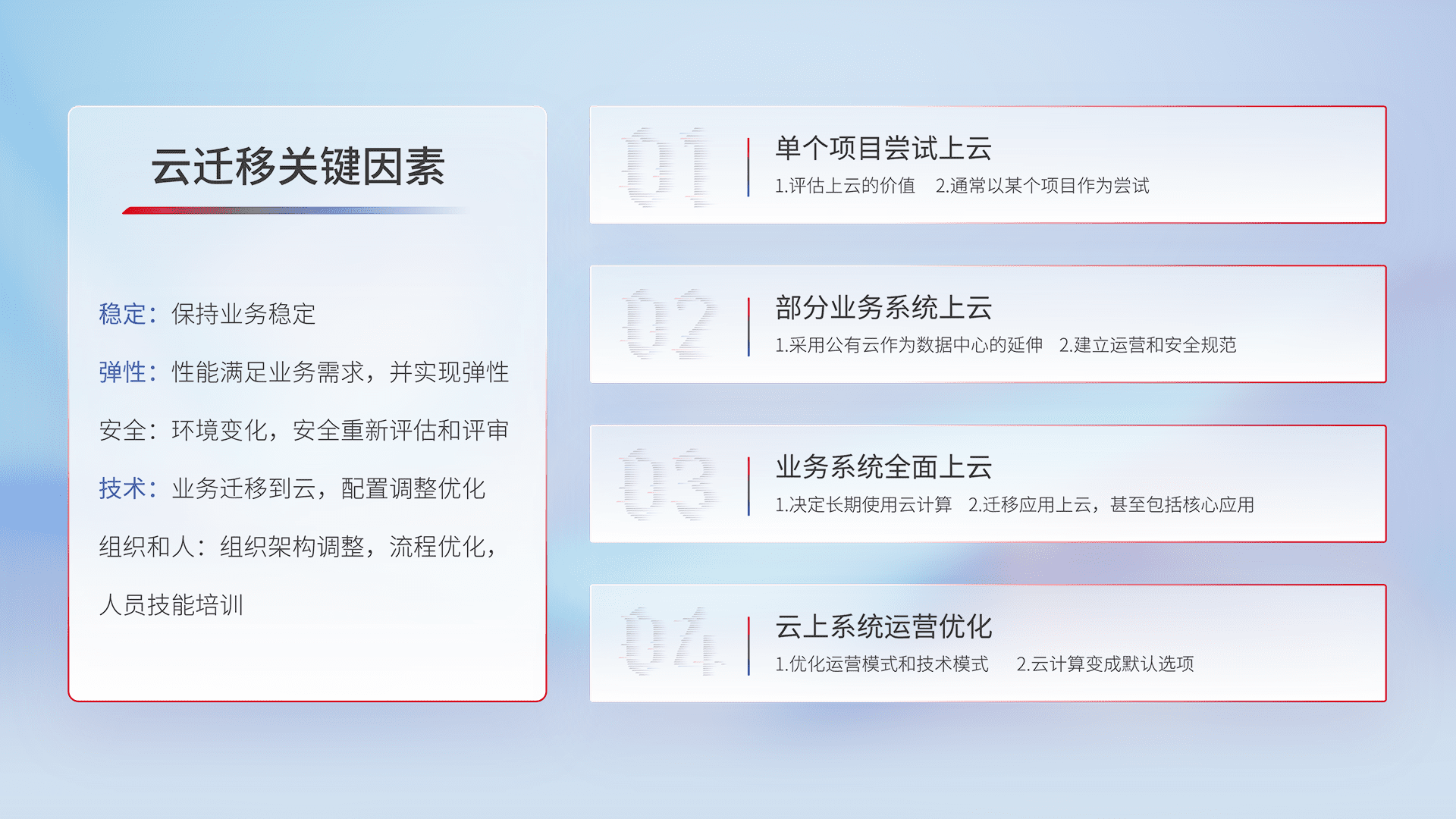 结合实际业务,,从规划设计、、云平台选型、、、、云原生改造、、数据迁移、、集成交付,,,迁移全过程为客户识别最佳上云路径,,,,做好风险识别管理,,,设计网络架构、、、身份权限、、、、安全审计合规、、操作审计、、日志审计、、、、监控告警策略、、、多站点容灾设计等,,,对云上基础设施进行整体规划,,提升IT治理水平,,,,以满足弹性、、高可用、、、、高性能的需求。。。