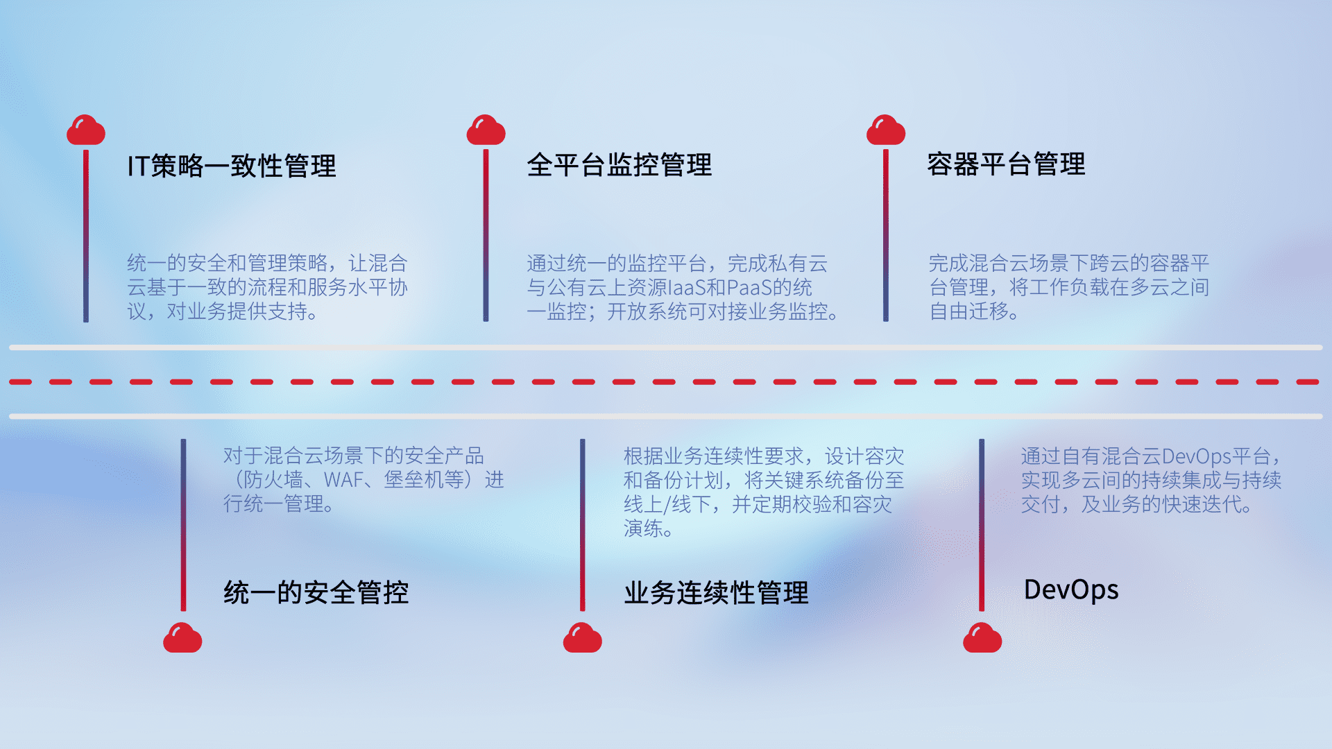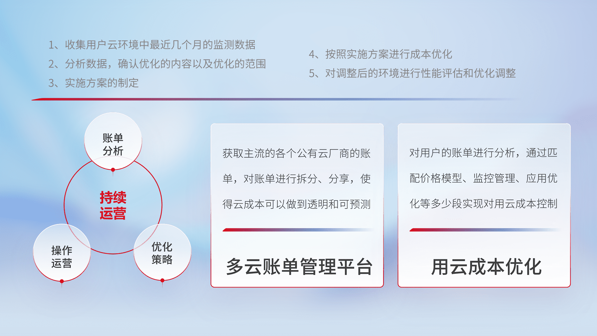通过多云纳管,,,,以统一的资源数据模型把客户的云资源进行抽象和封装,,进而实现对多云资源的统一操作,,保障云资源管理的可靠性、、、、稳定性与可用性。。。量身定制化运维内容,,,,配置、、、开发运维、、、补丁管理、、、备份、、、监控、、、、认证和访问管理、、、审计和日常巡检等,,保障在用云过程中的可靠度,,稳定度以及高可用率。。