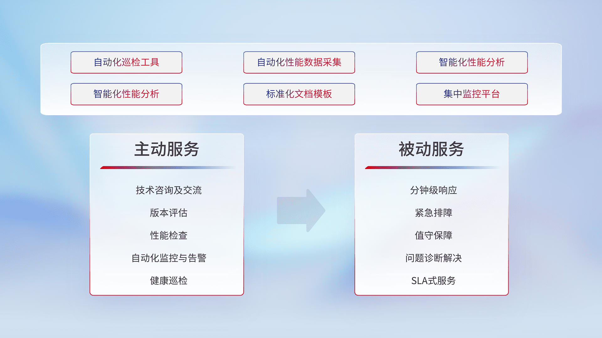 智能化工具和标准化文档,,保障服务质量,,,,提供主动服务(包含技术咨询、、、版本评估、、性能检查、、、自动化监控与告警、、、、健康巡检)和被动服务包含(分钟级响应、、、、紧急排障、、、、值守保障、、问题诊断解决、、、、SLA服务)。。