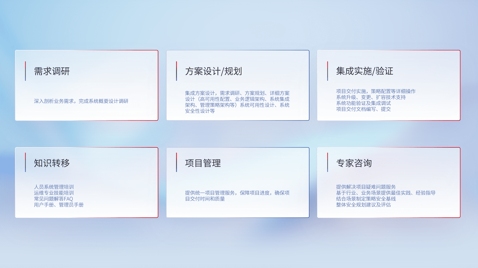 针对客户行业特性,,,,将宏观的安全战略和需求,,通过专业的交付服务,,,,实现项目落地,,,,为客户提供标准规范的集成交付服务。。